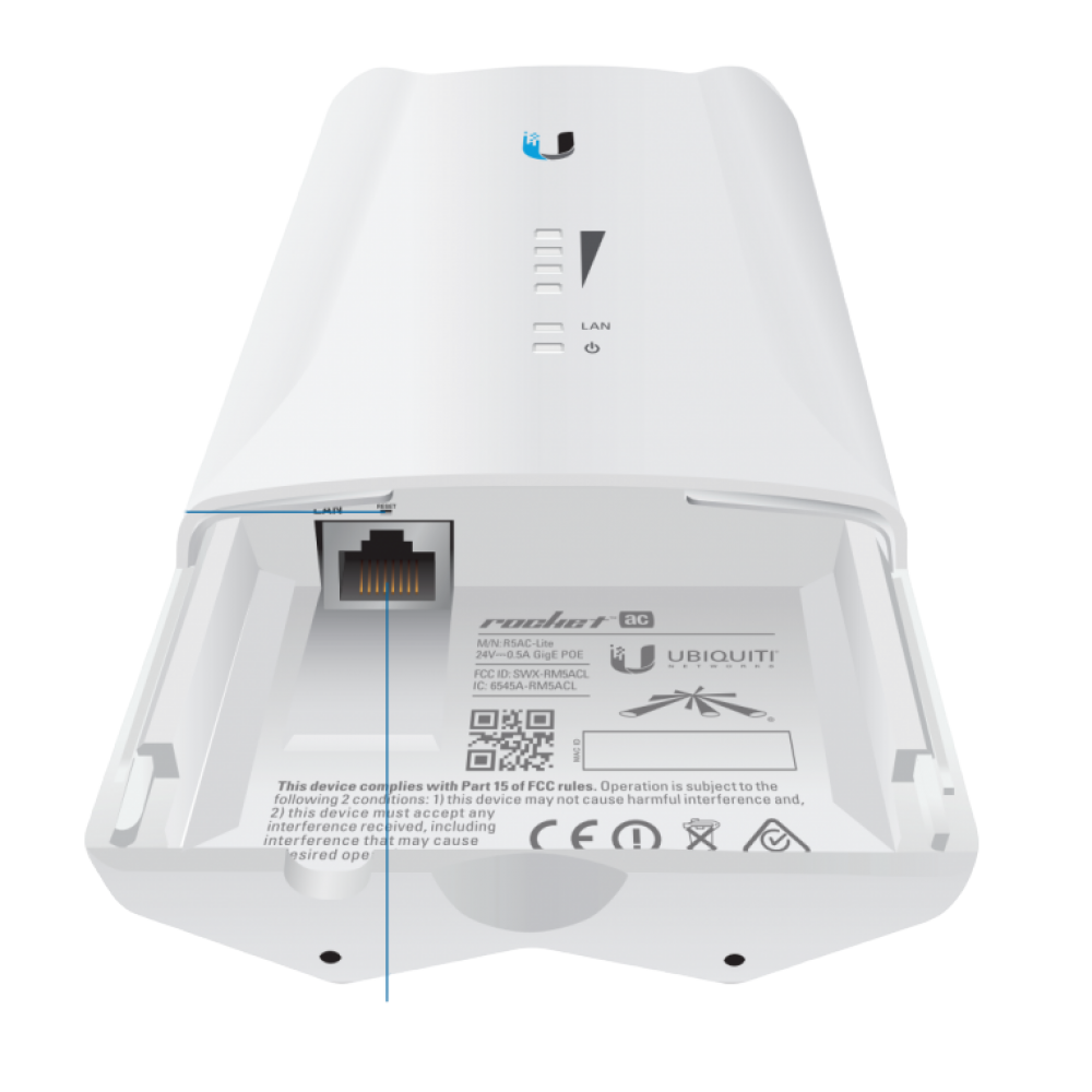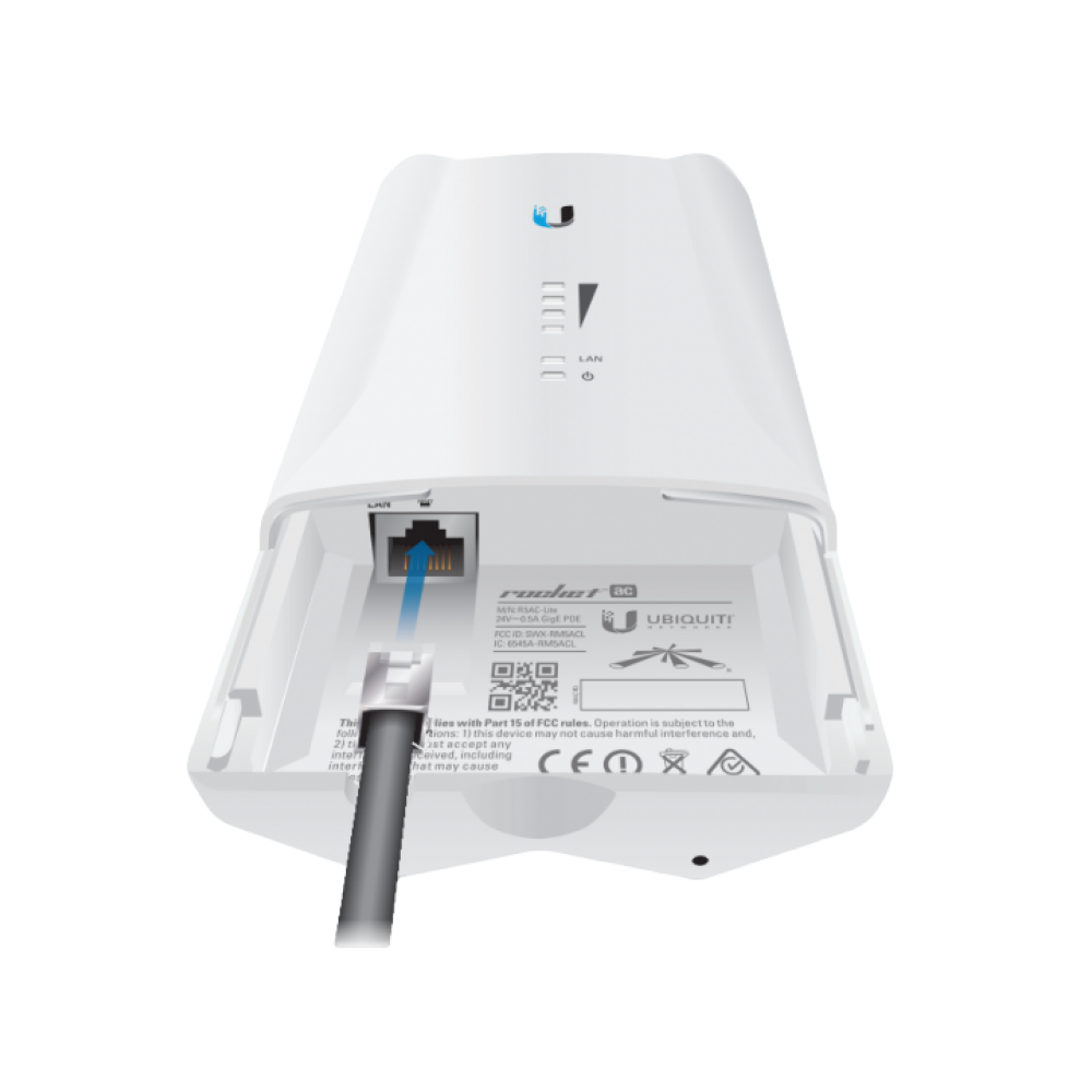 Rocket M5 AC PTP Lite - внешняя Wi-Fi точка доступа от Ubiquiti Networks (UBNT), работающая в диапазоне 5 ГГц и поддерживающая стандарт 802.11ac. Рекомендуется для использования в местах где эфир на 2.4 ГГц сильно зашумлен. Устройство работает только в режиме "точка-точка", в будущих версиях прошивки появится возможность создавать подключения "точка-многоточка" (начиная с версии AirOS 7.1).